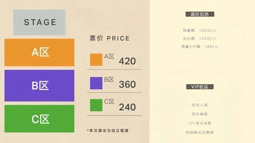 例如,以一首《单身旅记》实现破圈的乐队八仙饭店,正在进行他们名为“极乐大厦揭幕”的2024年全国巡演。在现已官宣的城市中,乐队将预售票价定在180元、全价票220元。同时,乐队还设定了320元的限量VIP票价,权益涵盖到优先排队进场、独享乐队2024版独家签名照一套、帆布袋一个、手账本一个、巡演系列纪念海报卡片。