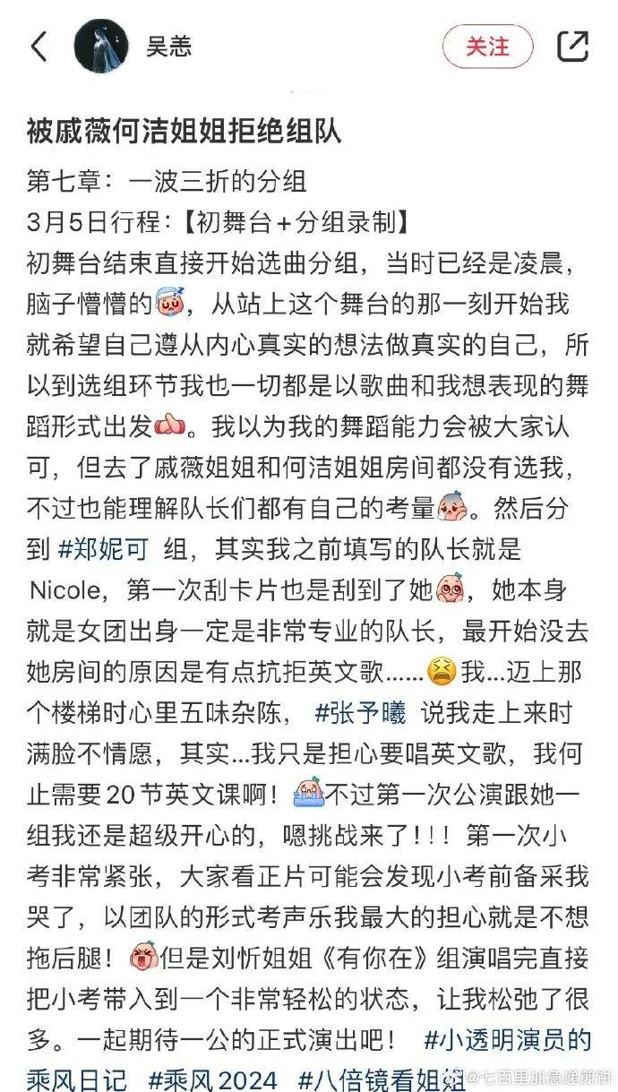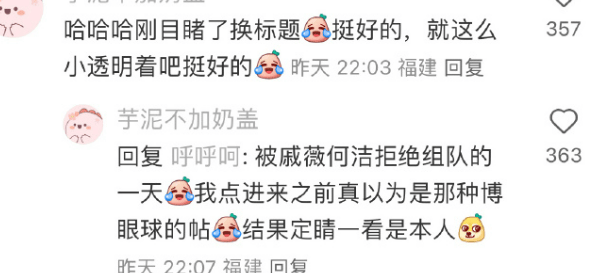 因为她在一公结束组队之后,发了条阴阳怪气,标题为“被戚薇何洁姐姐拒绝组队”的帖子。
