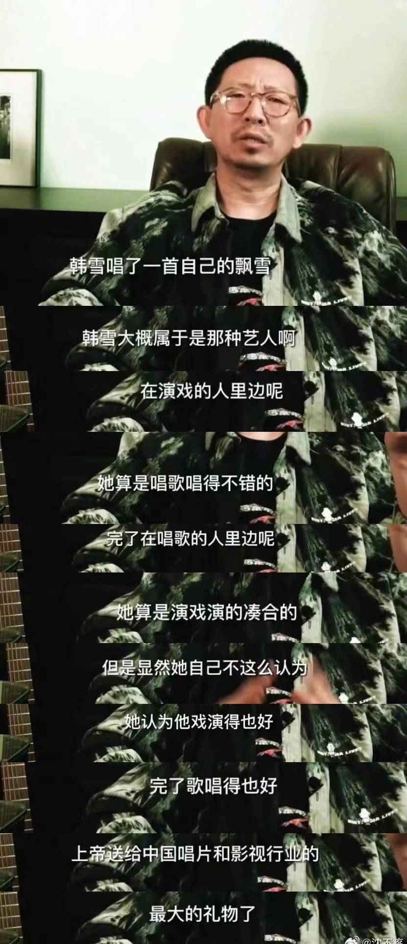 他认为韩雪是那种在演戏里边算是歌唱得不错的,在唱歌方面戏演得不错的,认为韩雪并不这么认为,认为自己戏演得也好,歌也唱得也好,是上帝送给中国唱片和影视行业的最大的礼物了。
