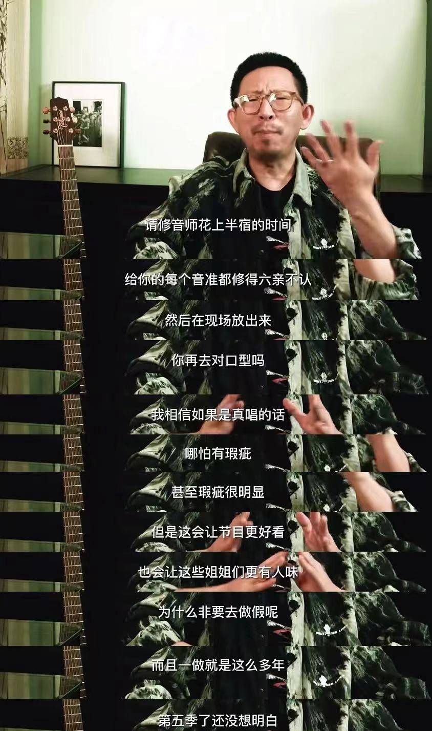丁太升炮轰节目大量的修音,修得六亲不认,现场放出来然后对口型,主张真唱,哪怕有瑕疵,也会让节目更好看,也会让这些姐姐们更有人味,为什么非要去做假,而且一做就是很多年,第五季还没想明白。