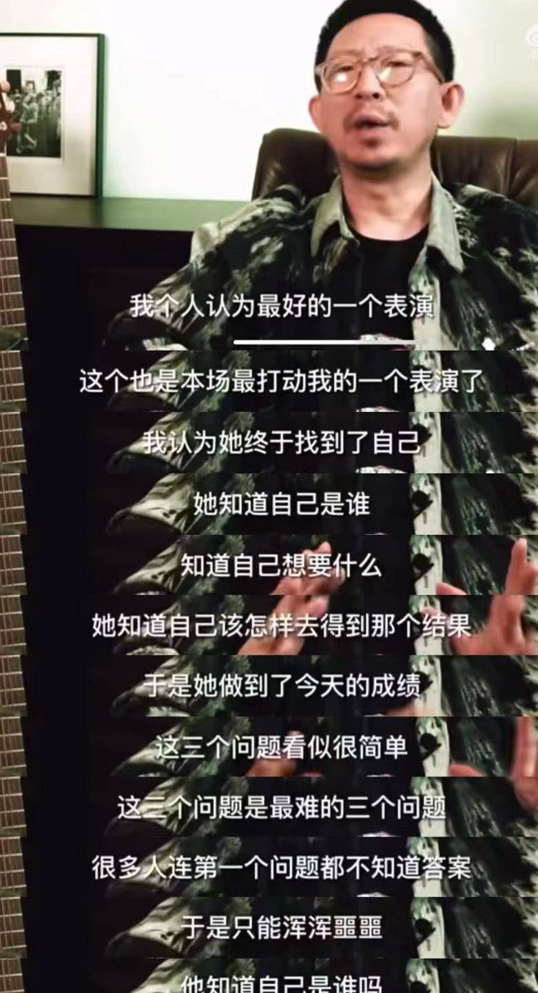 丁太升大赞何洁,认为她是最好的表演,也是本场最打动他的一个表演,认为她终于找到了自己,她知道自己是谁,知道自己想要什么,知道自己该怎样去得到那个结果,于是她做到了今天的成绩,这三个问题看似简单,其实是最难的三个问题,很多人连第一个问题都不知道答案,于是浑浑噩噩,他知道自己是谁吗?