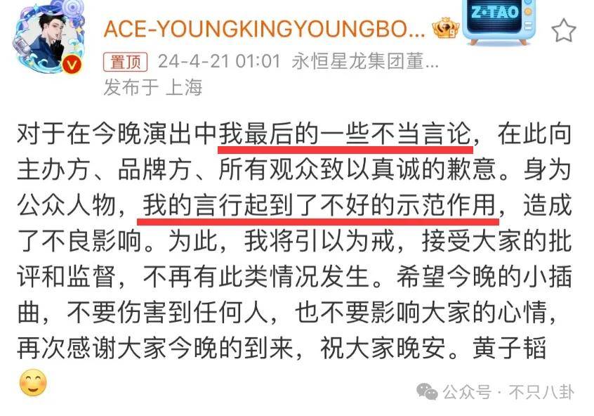 黄子韬怒怼小马丁的事件发酵后,黄子韬分别在多平台道歉,在微博的言辞比较官方,虽然也强调了是为“演出最后的不当言论”而道歉。