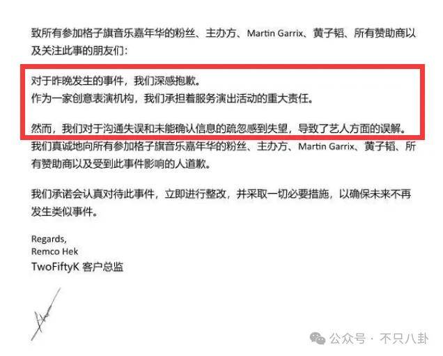 当天晚上,嘉年华主办方发布声明,只说因为沟通失误和未能确认信息的疏忽,导致艺人方误解了。至于误解了啥、是谁误解了,主办方没有多说。