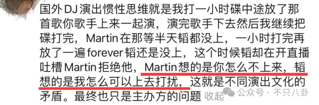 有网友认为小马丁也没错,国外DJ的习惯是中途放了哪首歌,歌手就上来配合,这是不同演出文化的矛盾。