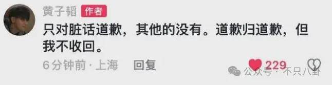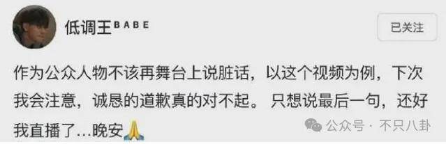 但他在抖上的道歉就刚多了:“只对在台上说脏话道歉,其他的没有,道歉归道歉,但我不收回。”