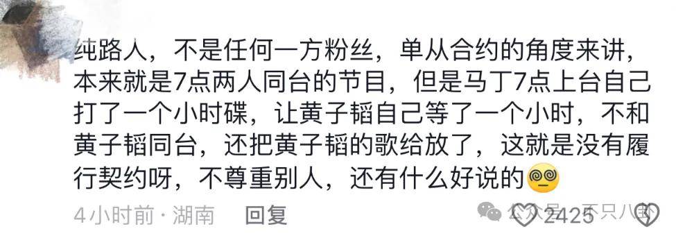 有网友认为黄子韬没错,单从公开的信息来看,合作舞台就是7点的,黄子韬被撂在后台干等着,就是小马丁没有契约精神、不尊重人。
