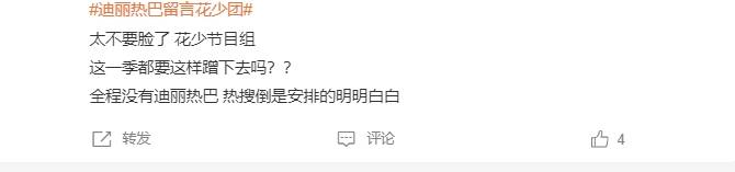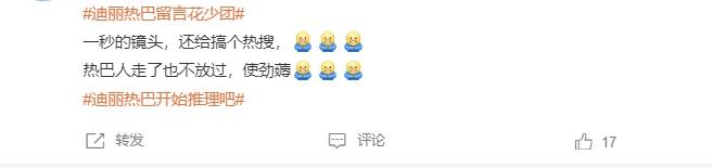 值得注意的是,在《花少好友季》更新后,一则名为“迪丽热巴留言花少团”的词条登上热搜,引得超多网友围观,但是其粉丝并不买账,明确表示迪丽热巴压根没时间参加《花少好友季》的录制,节目组就别带她的名字炒热度了,还顺带宣传了热巴的新综艺《开始推理吧2》。