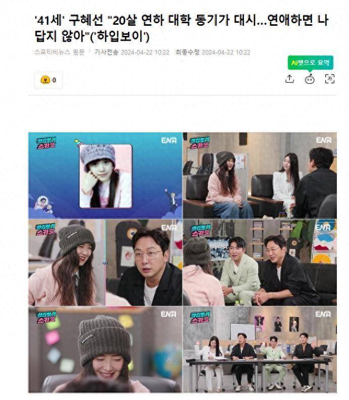 4月22日,有韩国媒体报道,出演新综艺节目的,韩国知名女星,演员具惠善,通过公开自己的爱情生活、特殊技能和选角秘密等一切,展现了她的直言不讳。