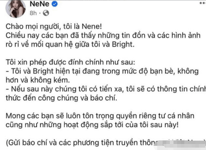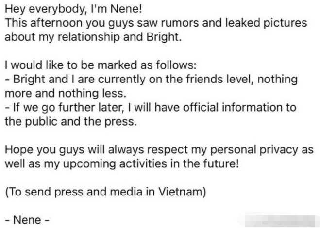 搜狐娱乐讯 4月22日,Nene郑乃馨发文回应与bright恋情一事,她表示两人目前只是朋友,如果以后再进一步,会有官方信息向公众和媒体公布。希望大家能永远尊重她的个人隐私,以及未来的活动。