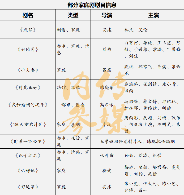 据不完全统计,目前待播的家庭题材剧高达10部以上,其中包括《成家》《好运家》《六姊妹》《小日子》《好团圆》《小夫妻》《时光正好》等。