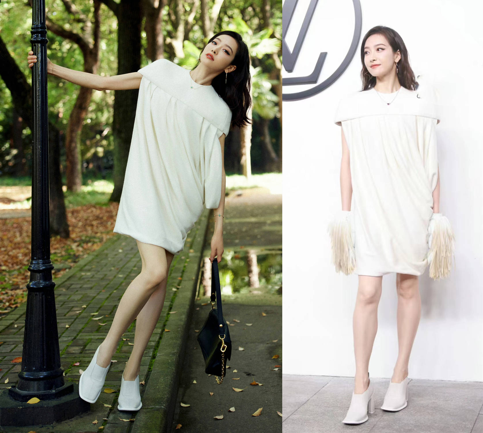 而宋茜则是一身白色系,同样是下身失踪风格,造型是要比欧阳娜娜看起来柔和一些,但因为穿个像是酒店拖鞋一样的高跟鞋,显得腿部线条并不修长,再加上上身宽松遮挡了腰线,整体是给人一种五五分的既视感。光看工作室的精修图,能感觉宋茜有一双长腿,但看了现场图,就又显得腿很短。