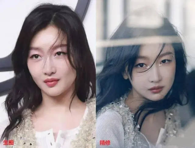 而妆容看上去跟精修也是有很大差距,生图周冬雨的脸型还是因为过于瘦小显得有些内凹,金色眼线灯光下并不明显。