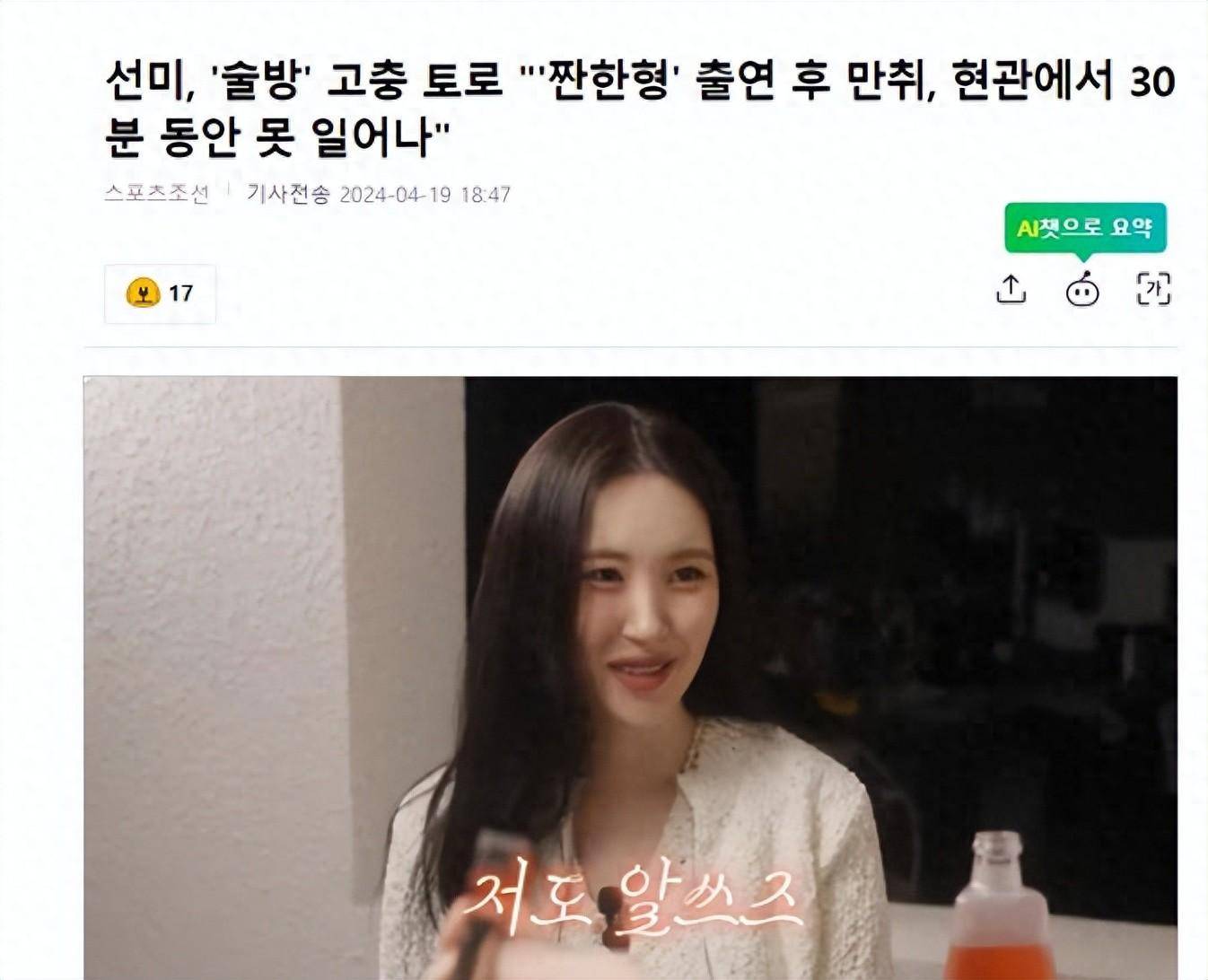 韩国知名女星,歌手宣美,透露她在综艺节目《咸哥哥》上喝多了,回家时躺门口30分钟都起不来。