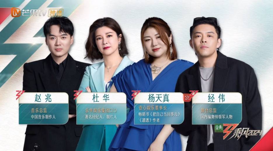 4月19日,由芒果台独家打造的全女性舞台竞技类真人秀《乘风2024》强势回归,最新一季不仅邀请了黄晓明继续担任乘风见证人,齐思钧担任主持,还齐聚了杜华和杨天真两位顶级经纪公司老总,再加上专业的音乐总监赵兆和舞台总监经伟,专业度毋庸置疑。