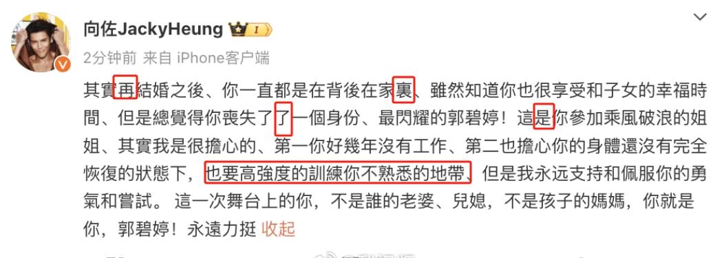 而在郭碧婷初舞台后,向佐火速发文为其打call,一方面担心郭碧婷几年没工作,一下子进入到不熟悉的领域会不适应,另一方面也表示会全力支持她的选择,全盘力挺郭碧婷。但是他的小作文发布后,被眼尖的网友发现错字连篇,读起来也不通顺,调侃他改改再来,用心不是嘴说说就行。