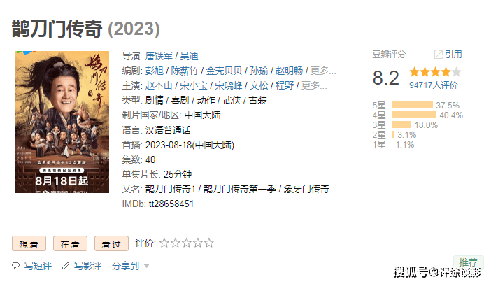 口碑上,《鹊刀门传奇》目前的豆瓣评分是8.2分,该剧短评区首页是一个五星,两个四星和两个三星评论。