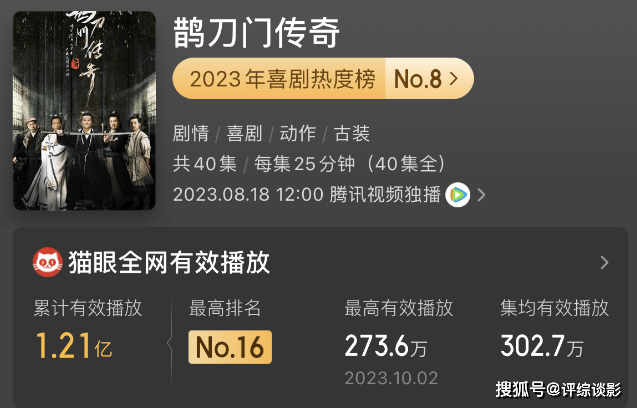 数据上,《鹊刀门传奇》的累计播放量已经达到1.21亿,最高有效播放是273.6亿。
