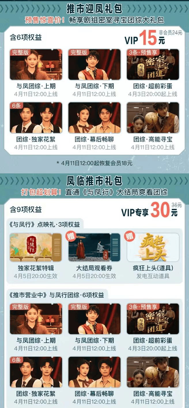 观众可以通过两种方式解锁《与凤行》团综:其一,单独为团综打造的“推市迎凤礼包”,非VIP24元,VIP15元,内容包括与凤团综上下期、团综独家花絮、幕后畅聊、高能寻宝等。其二,则是与剧集点映礼打包的“凤临推市礼包”,VIP专享30元,即可解锁大结局观看券、独家花絮特辑、以及团综相关内容。