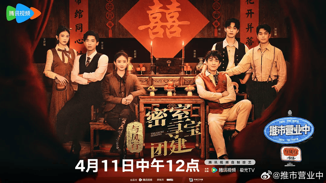另一方面,哪怕是仅从综艺维度来看,《与凤行》团综也呈现出了不错的品相。首先,我们在2023年综艺复盘中就曾提出,综艺题材频繁洗牌、但密室推理却持续高光,仅仅是“中式恐怖”就足以吸引一批类型题材粉丝入局;预热阶段就释出的赵丽颖判官造型,片头的非遗项目、民俗文化,也都极具吸引力。