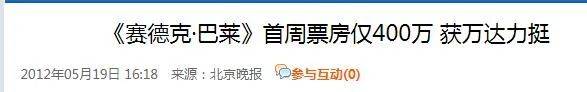 但是,当年因为引进过程耽误时间过长、宣传时间太短、没有明星等种种原因,《赛德克·巴莱》在大陆的票房遇冷。不过,当时万达院线主动出手为《赛德克·巴莱》排片,媒体、影评人纷纷发文力挺,也成就了一段台湾电影在大陆上映的佳话。