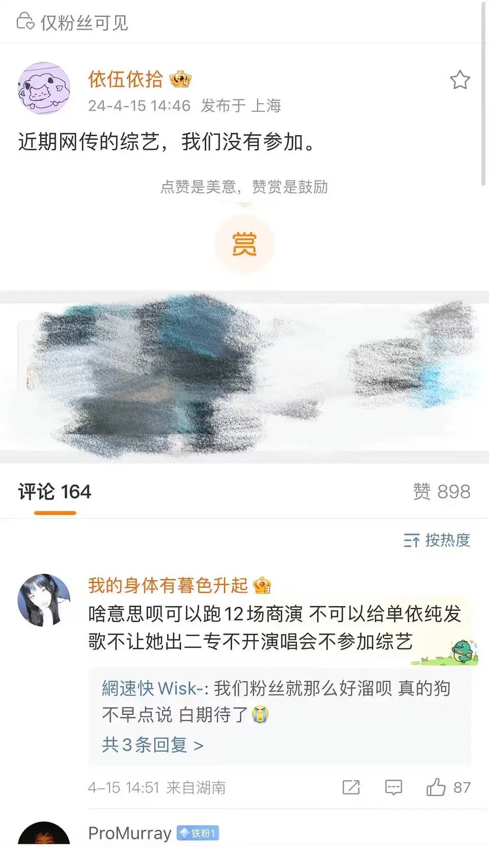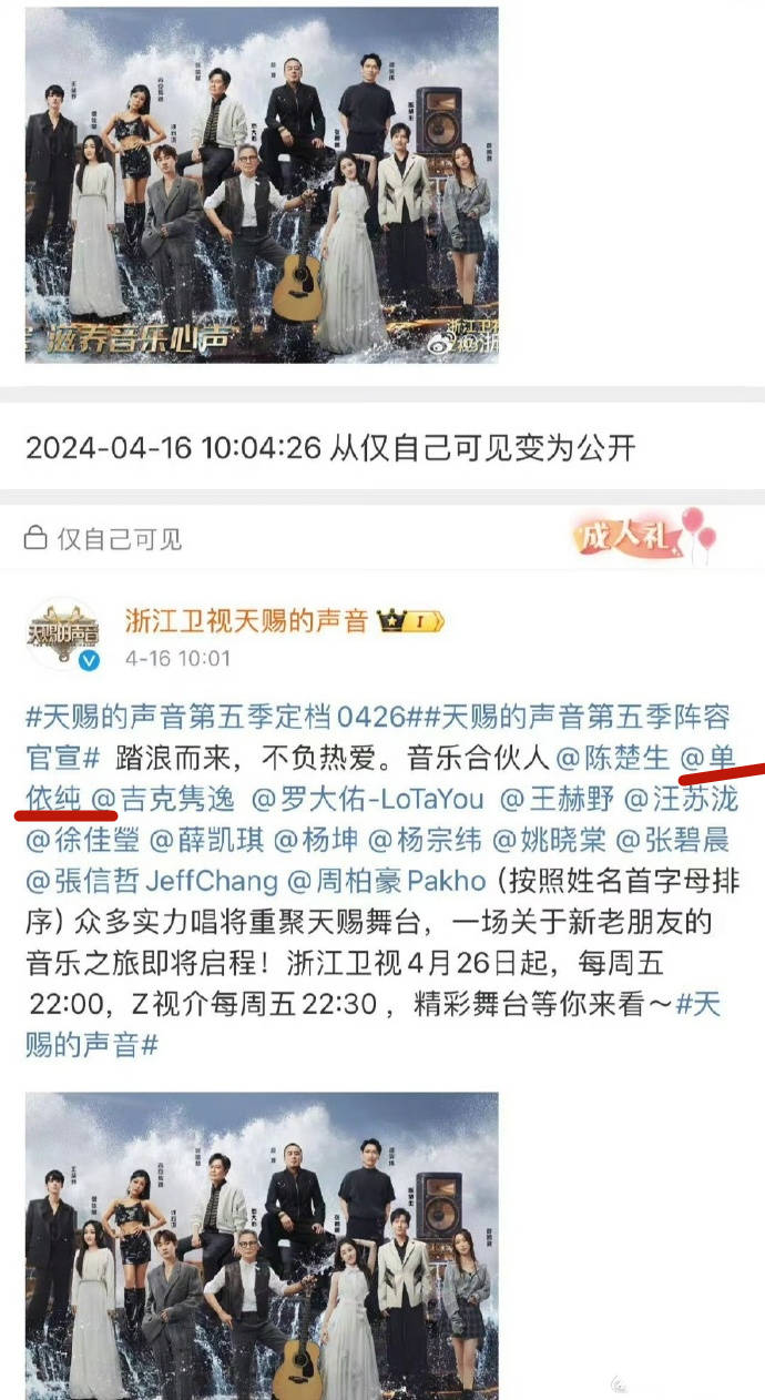 而值得一提的是,在节目组更改动态时,单依纯用小号自己否认了参加网传综艺的传闻,但关于这个综艺到底是在否认《天赐的声音》还是《歌手》,让不少人摸不着头脑。不过从亲密关系来看,单依纯拒绝《歌手》的可能性更大一些。