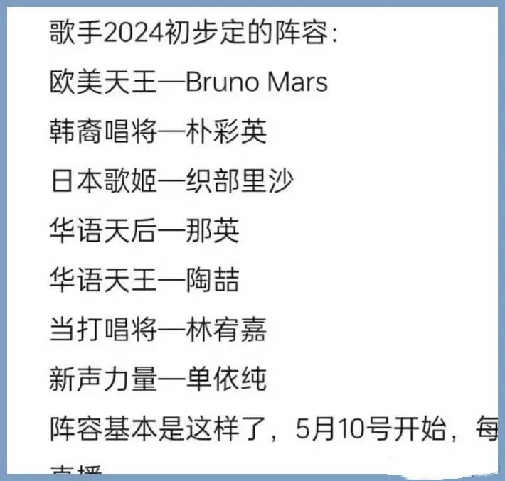 而比较尴尬的是,如今《歌手2024》依然并未公布选手名单,但总体来看留给《歌手》的新生代和中生代歌手已经不多。在拟邀名单中,七位的嘉宾阵容对比《天赐的声音》一把一把的艺人官宣,也稍显单薄,况且有消息爆料单依纯似乎并不在《歌手2024》的邀请之列。