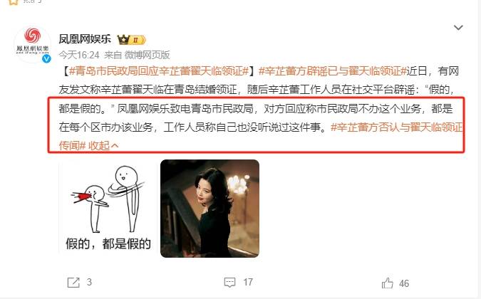 对此,青岛市民政局亲自出面发声,表示市民政局不办这个业务,都是在每个区市办该业务的,目前并没有没听说过辛芷蕾和翟天临领证这件事。不得不说,前有工作人员否认,后有官方出面为其辟谣,应该能确认这次不过是一场造谣而已,而造谣者也已删除了该爆料。
