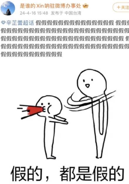 4月16日,辛芷蕾工作人员终于对此作出了回应,一口气发了135个假,并且附上了一个“假的,都是假的”表情包,不仅明确否认了此事,还能从字里行间感受到他们对这件事非常无语,情绪很激动。不得不说,在这个声明都没什么可信度的现下,辛芷蕾工作人员没有明确说是什么事,或许还是有很多人不信。