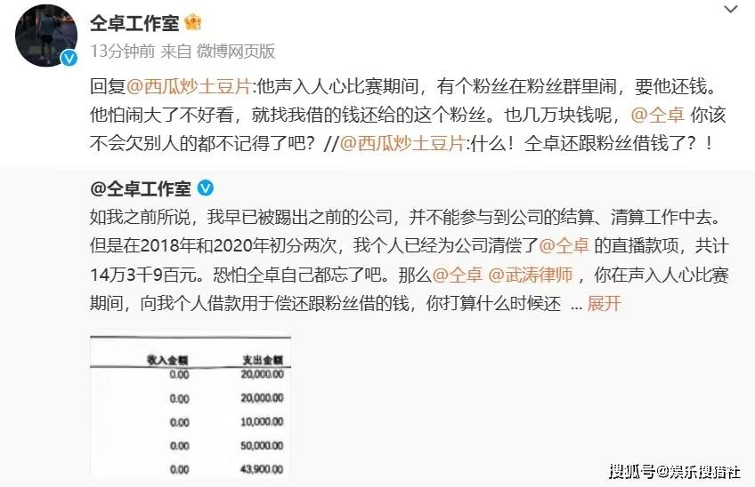 原标题:仝卓工作室再发文向仝卓要债,表示仝卓向他个人借款用于偿还跟粉丝借的钱