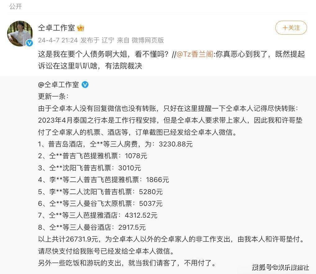 此前,仝卓工作室 发文向仝卓本人讨债:2023年4月,仝卓原本前往泰国进行工作行程,却因为希望携带家人而引发了一系列麻烦。这一意外给工作室增加了不小的负担。工作室及其工作人员不得不垫付了仝卓家人的一系列费用,包括机票、酒店等,总计金额高达26731.9元,但仝卓本人一直没有归还。后面还曾多次喊话多位明星欠债不还。