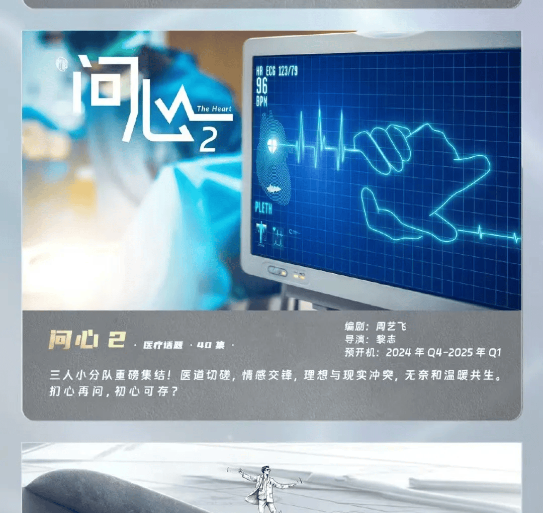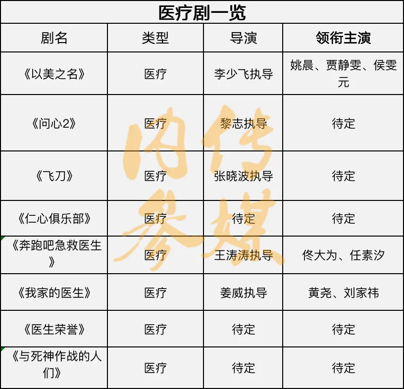 据不完全统计,目前待播的医疗剧达8部以上,包括《以美之名》《问心2》《飞刀》《仁心俱乐部》《奔跑吧急救医生》《我家的医生》《医生荣誉》《与死神作战的人们》。