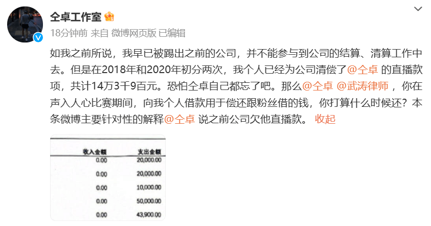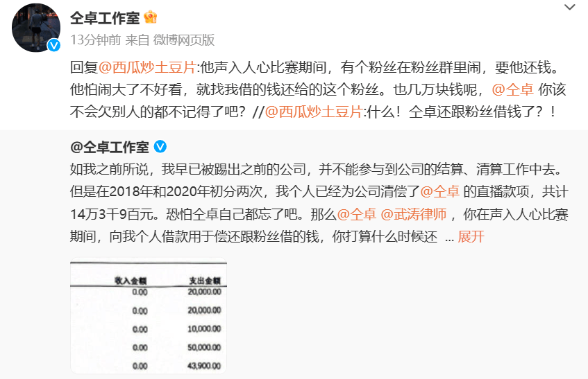原标题:仝卓工作室又发文称:仝卓《声入人心》比赛期间曾向粉丝借钱