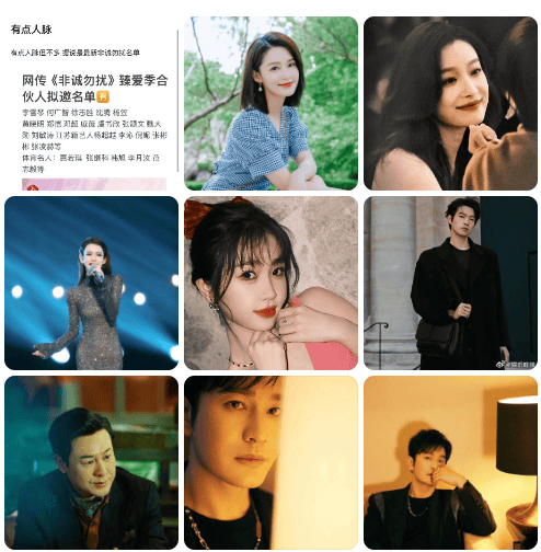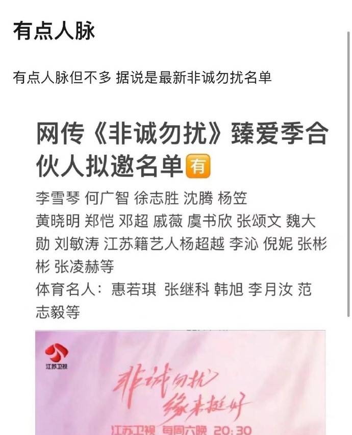 搜狐娱乐讯 4月16日,《非诚勿扰》臻爱季合伙人拟邀名单流出,网传有演员李沁、倪妮、黄晓明、魏大勋、张颂文、虞书欣等,脱口秀演员杨笠、何广智、徐志胜以及体育名人惠若琪、张继科等人。