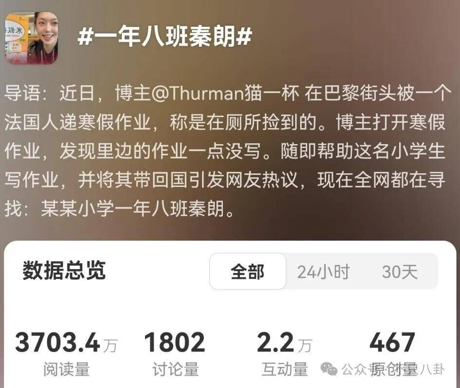 秦朗把作业丢到法国,大批网友想看后续如何发展,多少有点不管自己淋没淋过雨,也要把秦朗的小雨伞撕碎的意思。