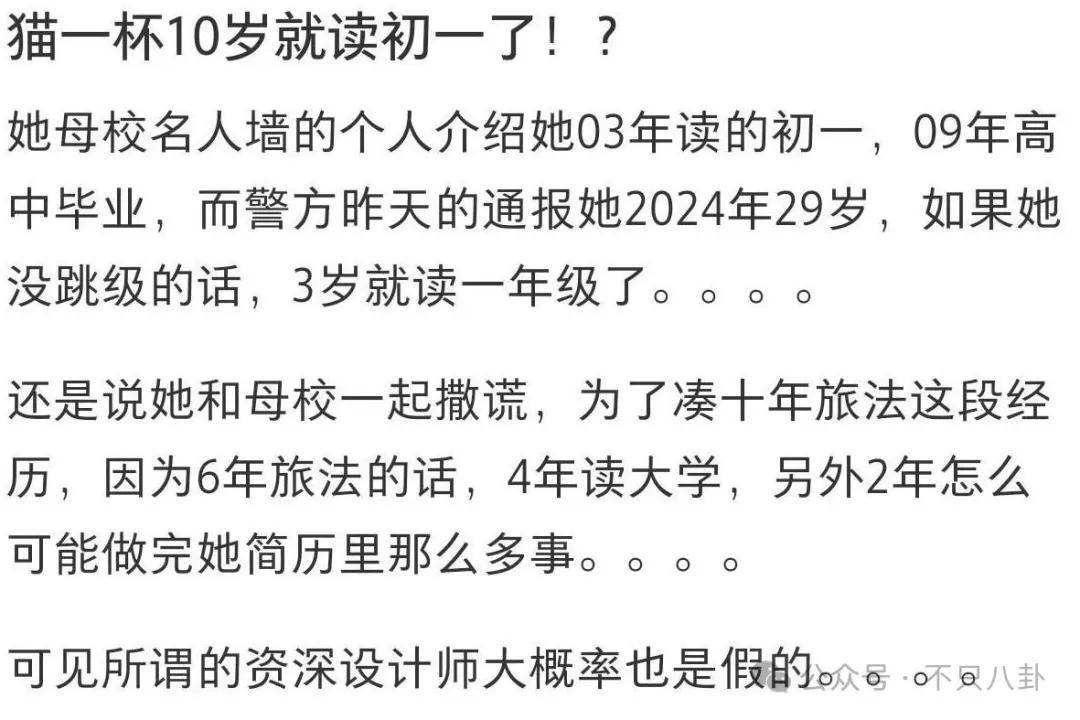 有网友研究了猫一杯的经历,要想达到如今的成就在时间上就不太可能,除非她3岁就上小学。
