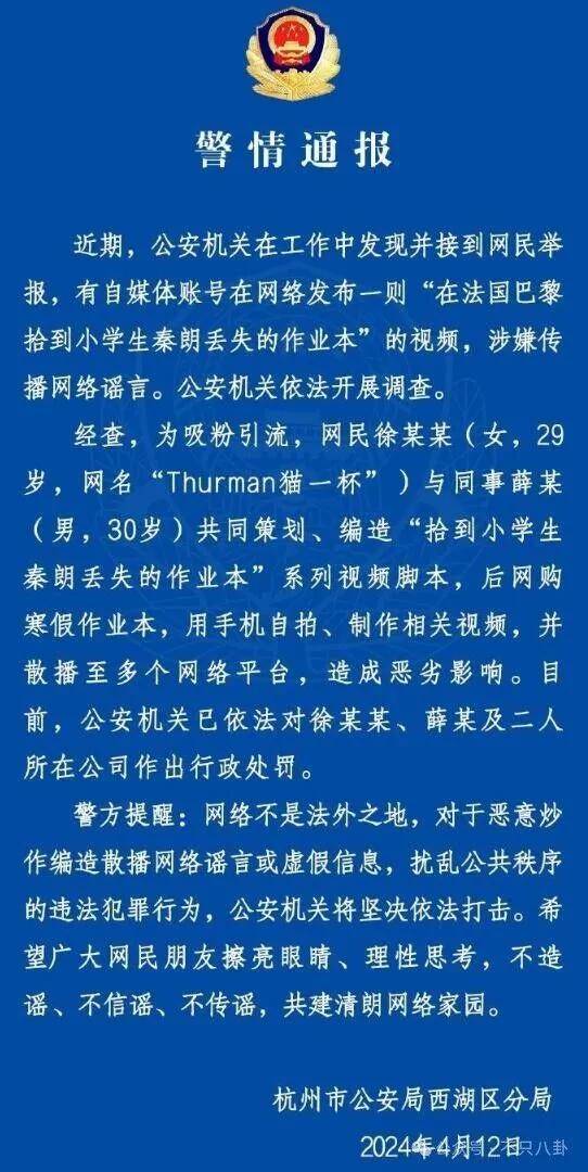 当时有很多持怀疑想法的网友对视频进了行举报,杭州西湖警方在受立案工作之后,查询了符合秦朗年龄段小朋友的出境记录,但没有找到,警方认为视频有造假博流量的嫌疑,决定一查到底。