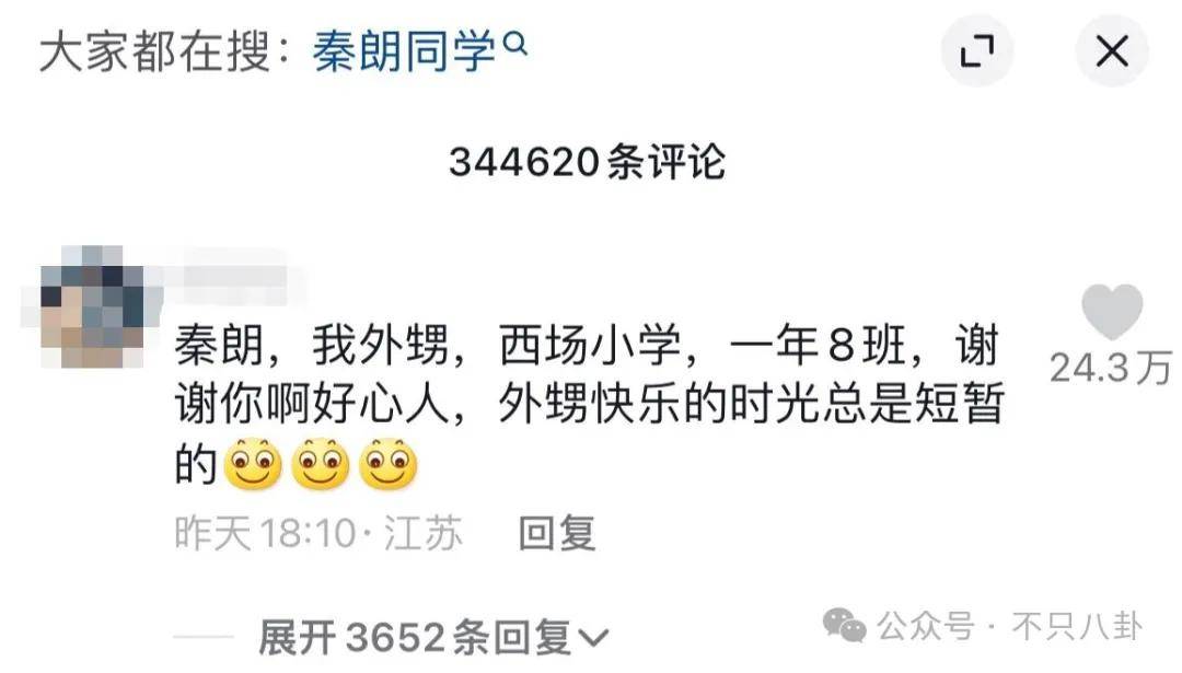 在视频评论区,一位IP在江苏的网友自称是秦朗的舅舅来认领作业,他说秦朗就读于西场小学,这条评论被网友顶了上去,点赞量超过24万。
