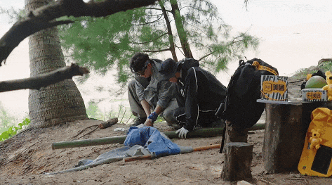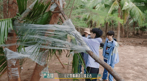 冬天的海岛昼夜温差极大,大家晚上过夜却连个住的地方都没有,摆在大家面前最大的难题就是搭建“庇护所”。保鲜膜、树枝、芭蕉叶、塑料布,这些就是他们搭建住处的全部材料了。