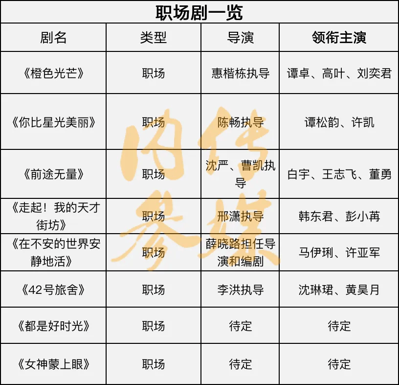 据不完全统计,目前待播的职场剧达8部以上,包括《橙色光芒》《你比星光美丽》《前途无量》《走起!我的天才街坊》《在不安的世界安静地活》《42号旅舍》《都是好时光》《女神蒙上眼》。
