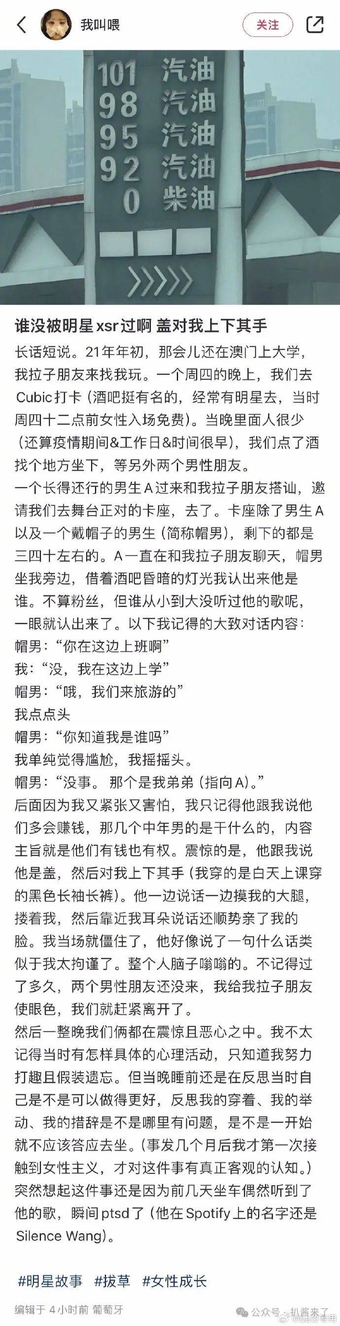 事件简述:有网友投稿说曾经在澳门被一个自称是弯的男艺人占便宜摸大腿清廉什么的,然后网友们根据21年年初的时间线推断出帖子里讲的是汪苏泷;
