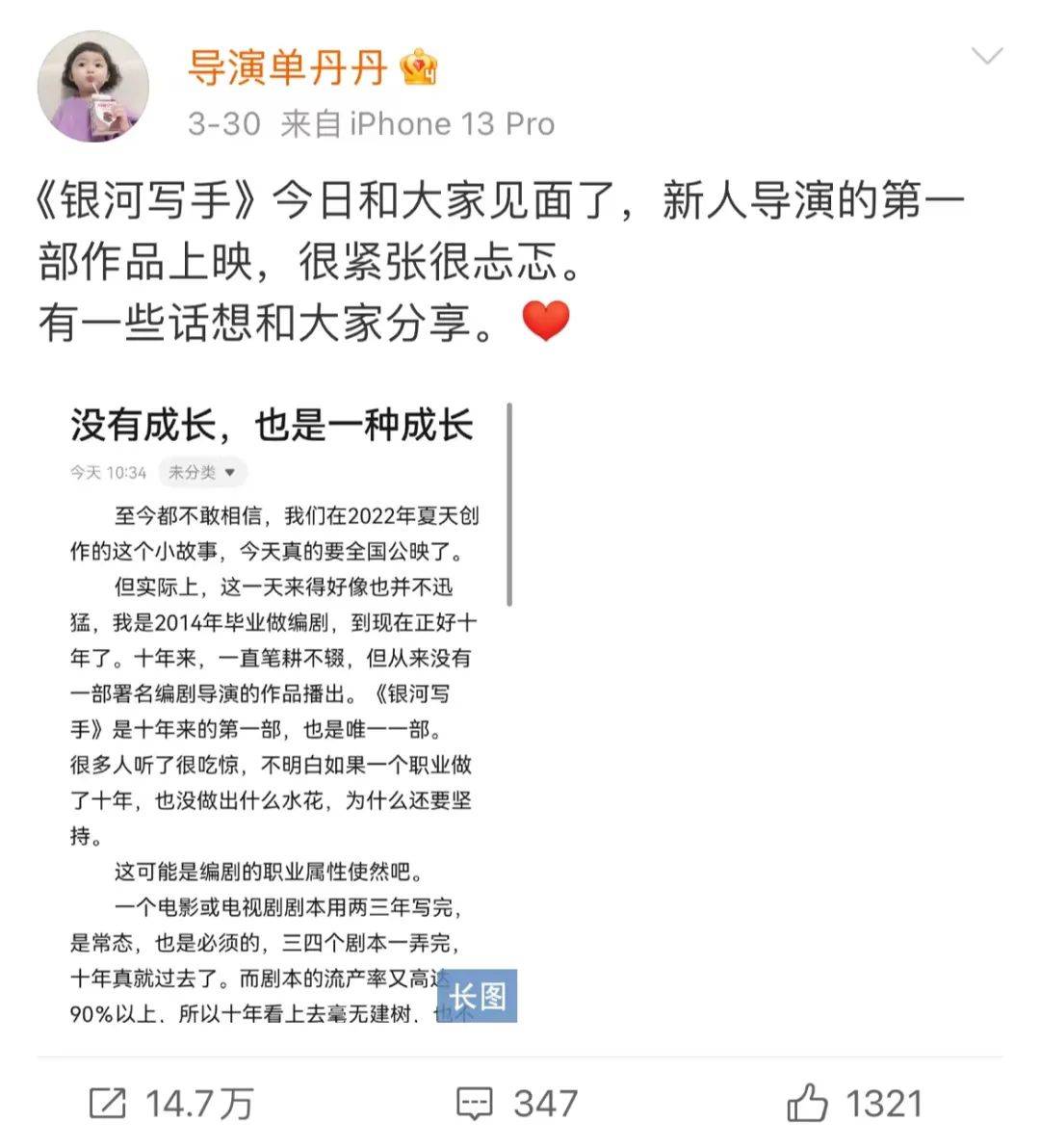 电影上映后,单丹丹也在微博写下了她对自己十年编剧生涯的总结,这十年里话剧、电视剧、网络电影、院线电影、小品、短视频、综艺,什么活儿都接。在那个时期的影视行业里做编剧,头疼的是找过来的项目太多,流产也太快。用她自己的话来说,“你不知道哪片云下面有雨,每个人都想捞一个项目。”
