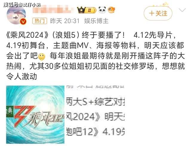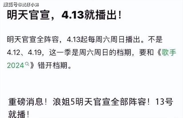 随后,又有娱乐博主发布消息,表示《浪姐5》的定档时间要进行延期,改成了4月13日上线先导片,正片内容将于4月20日起上线,每周六、日进行,再次成为了新的焦点。