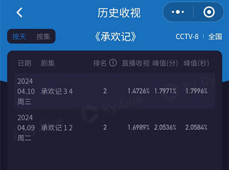 4月11日,酷云开出《承欢记》首播日和次日的收视率数据。这部电视剧的首播收视率是1.6989%,次日收视率是1.4726%。次日收视率的走跌,并不符合正常电视剧的播出规律,它更类似流量明星主演的电视剧的数据走势情况。