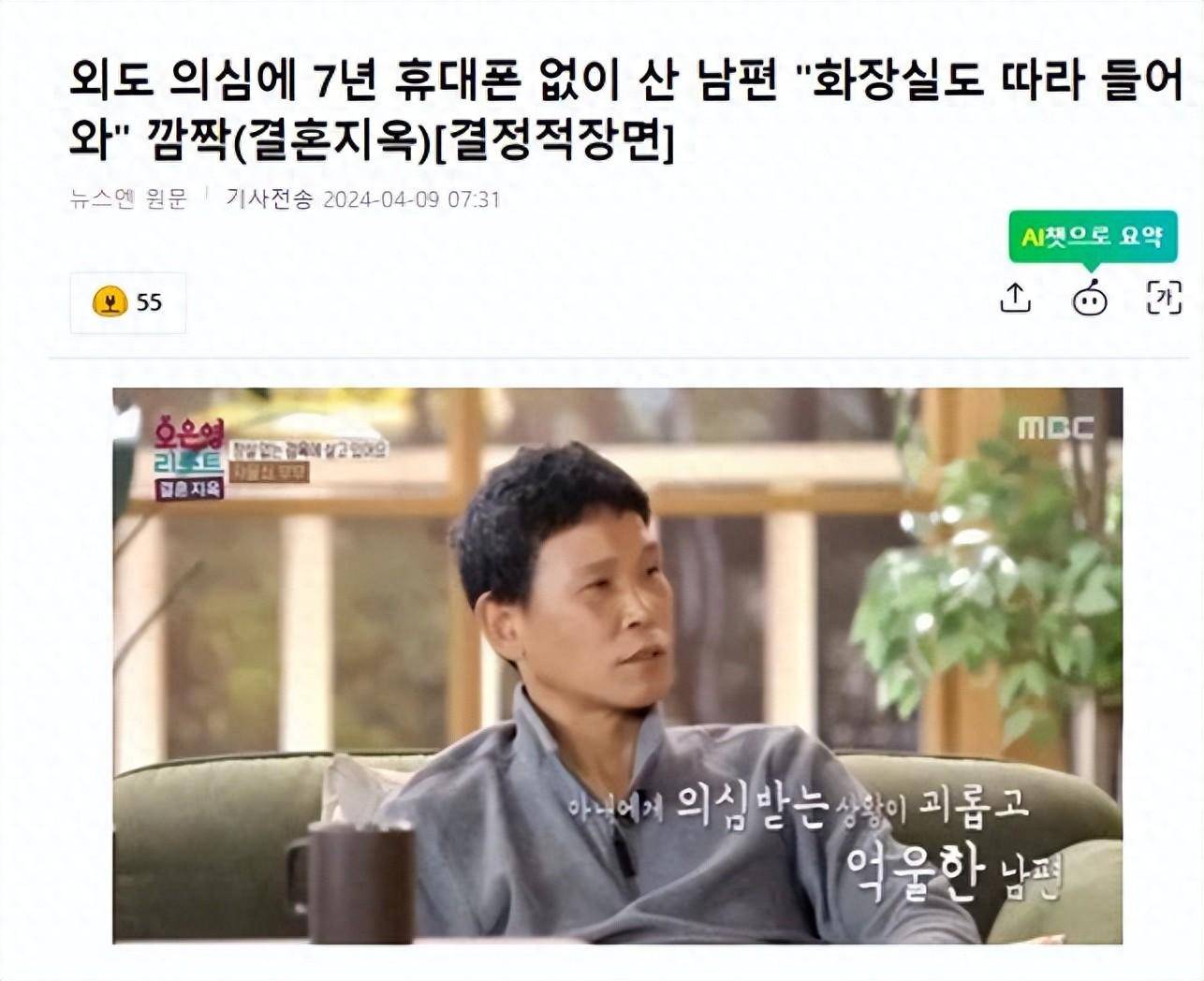 4月9日,有韩国媒体报道,在综艺节目中,一位因妻子的怀疑,而被掌控一切的丈夫的故事被公开。