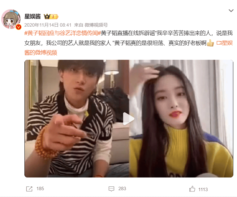 三、黄子韬借着老板员工名义谈恋爱当年,黄子韬带着自己旗下女团成员徐艺洋上了节目《创造营3》。