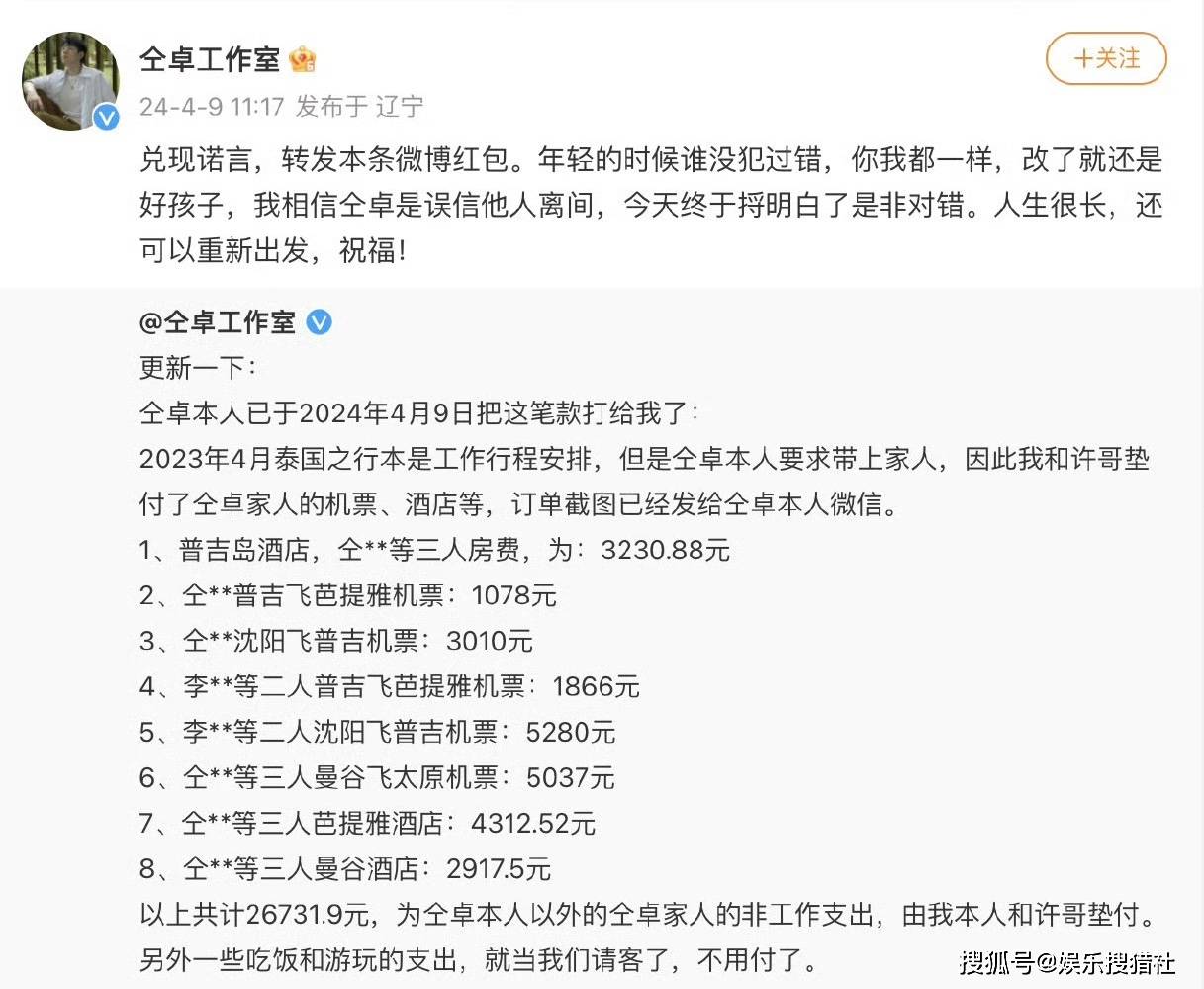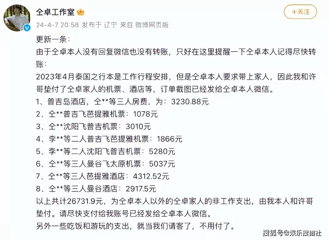 据悉,2023年4月,仝卓原本前往泰国进行工作行程,却因为希望携带家人而引发了一系列麻烦。这一意外给工作室增加了不小的负担。工作室及其工作人员不得不垫付了仝卓家人的一系列费用,包括机票、酒店等,总计金额高达26731.9元,但仝卓本人一直没有归还。