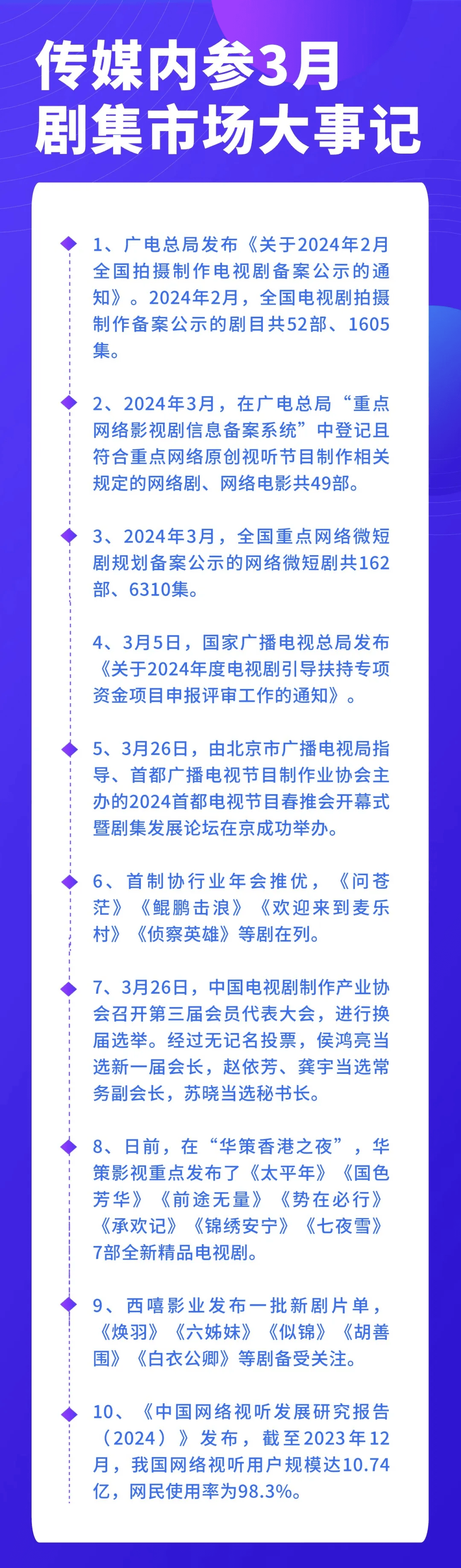 市场方面,3月,华策影视、西嘻影业等头部影视公司相继发布一批即将投入市场的项目片单,华策方面,《太平年》《国色芳华》《前途无量》《势在必行》《承欢记》《锦绣安宁》《七夜雪》7部全新精品电视剧亮相。西嘻影业发布的新剧片单包括《焕羽》《六姊妹》《似锦》《胡善围》《白衣公卿》等剧。