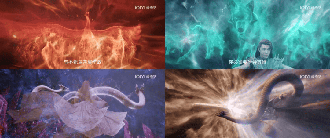 例如,在人䰠两族的多个打斗场面中,不死鸟、黑珑、白龙等神兽形象新奇生动,众多打斗招式和武器特效恢弘,热血震撼的视觉效果给观众留下了深刻印象。