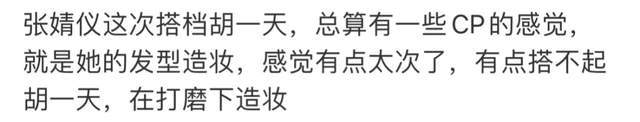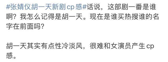 番位之争还没结束,很快观众讨论起了CP感。有人觉得胡一天和张婧仪很难擦出火花,尤其是胡一天看上去有点性冷淡风,感觉不太能和女演员产生化学反应。不过也有人持反对意见,胡一天就是靠小甜剧起家,没有CP感观众怎么会磕下去。