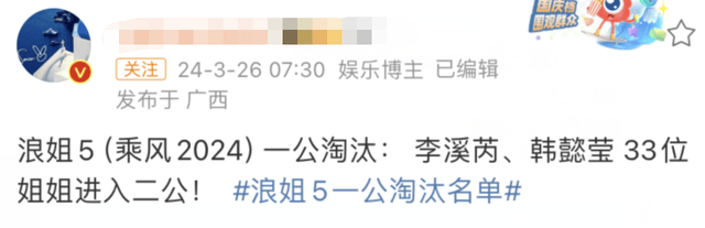 《浪姐》第五季还没定档什么时候开播,但一公据说已经录完了,而且有去现场观看的网友在网上发了一公的比赛结果,李溪芮跟Miss韩懿莹两人淘汰了。